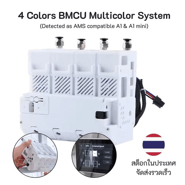 The BMCU multicolor system is an open-source, low-cost alternative to the Bambu Lab AMS, designed for users who want multicolor printing or automatic filament refill without the high cost of a closed system. It is available in two configurations: 2-Color version – ideal for dual-color prints or auto-refill when a filament spool runs out 4-Color version – the maximum supported configuration for multicolor printing The system does not support expansion beyond 4 channels, allowing users to choose the configuration that best fits their needs and budget. BMCU uses the BMCU370C Hall buffer, enabling bidirectional filament buffering and smoother filament feeding, which helps reduce stress and wear on the filament hub. It also supports long retraction after filament cutting, improving reliability during color changes. Compatibility Fully compatible with Bambu Lab A1 & A1 Mini P1 series support is experimental Tested and approved in our 3D printing farm in Bangkok. Local stock available for fast delivery.